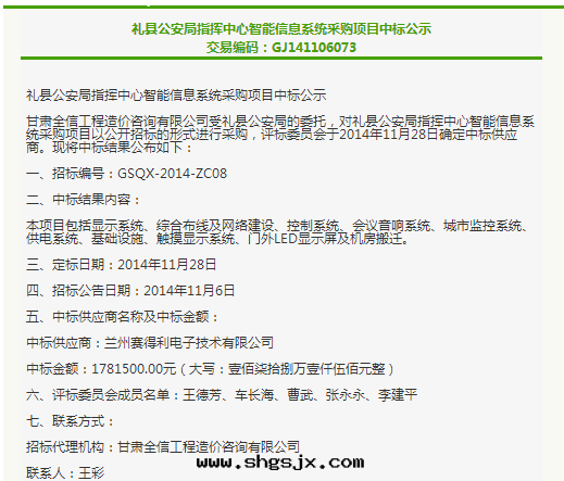 2016年(nián)3月(yuè)4日(rì),蘭州賽得利電(diàn)子技術(shù)有(yǒu)限公(gōng)司参與(yǔ)康縣(xiàn)政(zhèng)府采購中(zhōng)心(xīn)組織的(de)《康縣(xiàn)公(gōng)安(ān)局(jú)采購安(ān)裝(zhuāng)公(gōng)安(ān)視頻資源整合設備項目》招标(biāo)中(zhōng),最(zuì)終(zhōng)以(yǐ)良好(hǎo)的(de)信(xìn)譽、豐富的(de)行業經(jīng)验(yàn)、強(qiáng)大(dà)的(de)技術(shù)實(shí)力以(yǐ)及(jí)優秀的(de)方案(àn)、合理(lǐ)的(de)報價赢得了(le)招标(biāo)單位(wèi)的(de)肯定(dìng),順利中(zhōng)标(biāo)。