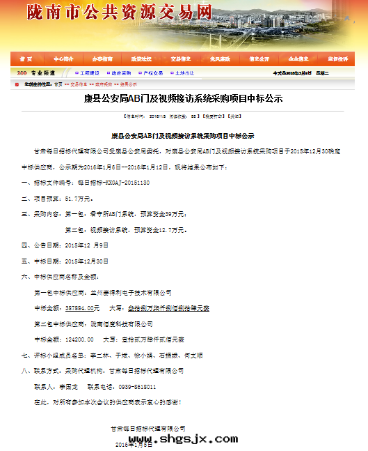 我(wǒ)公(gōng)司中(zhōng)标(biāo)康縣(xiàn)公(gōng)安(ān)局(jú)AB門(mén)及(jí)武警哨位(wèi)智能(néng)信(xìn)息系(xì)統采購項