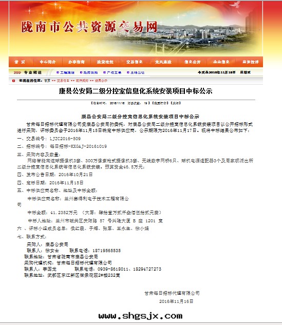 2016年(nián)11月(yuè)15日(rì),蘭州賽得利電(diàn)子技術(shù)工程有(yǒu)限公(gōng)司参與(yǔ)甘肅每日(rì)招标(biāo)代(dài)理(lǐ)有(yǒu)限公(gōng)司組織的(de)《康縣(xiàn)公(gōng)安(ān)局(jú)二(èr)級分(fēn)控室信(xìn)息化(huà)系(xì)統安(ān)裝(zhuāng)項目》招标(biāo)中(zhōng),最(zuì)終(zhōng)以(yǐ)良好(hǎo)的(de)信(xìn)譽、豐富的(de)行業經(jīng)验(yàn)、強(qiáng)大(dà)的(de)技術(shù)實(shí)力以(yǐ)及(jí)優秀的(de)方案(àn)、合理(lǐ)的(de)報價赢得了(le)招标(biāo)單位(wèi)的(de)肯定(dìng),順利中(zhōng)标(biāo)。中(zhōng)标(biāo)金(jīn)額为(wèi):412352.00元(yuán)。