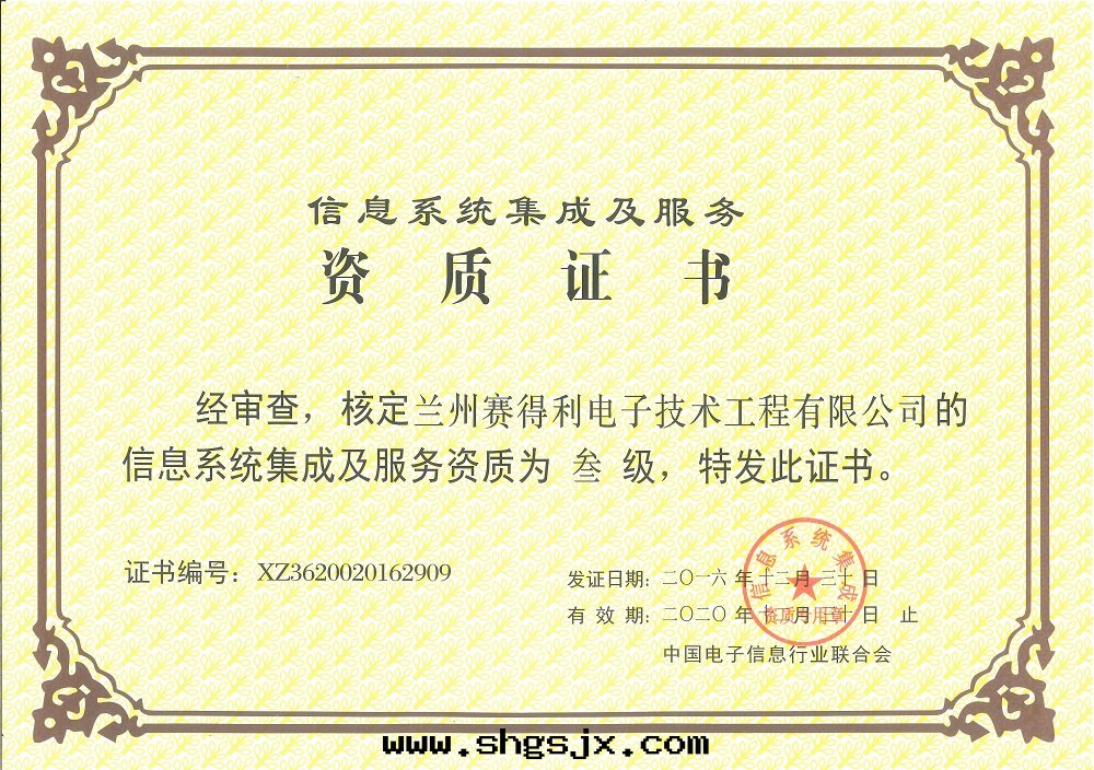 2016年(nián)11月(yuè)我(wǒ)公(gōng)司經(jīng)过(guò)中(zhōng)國(guó)電(diàn)子信(xìn)息行業聯合会(huì)的(de)評審,最(zuì)終(zhōng)在(zài)12月(yuè)30日(rì)我(wǒ)公(gōng)司獲得了(le)由(yóu)中(zhōng)國(guó)電(diàn)子信(xìn)息行業聯合会(huì)頒發(fà)的(de)信(xìn)息系(xì)統集成(chéng)及(jí)服(fú)務(wù)叁級資质!