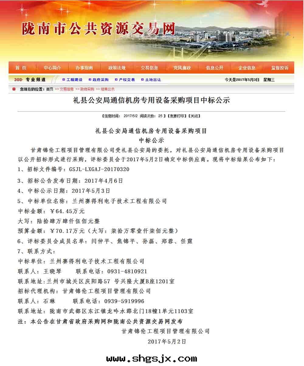 2017年(nián)5月(yuè)2日(rì),蘭州賽得利電(diàn)子技術(shù)工程有(yǒu)限公(gōng)司参與(yǔ)甘肅錦倫工程項目管(guǎn)理(lǐ)有(yǒu)限公(gōng)司組織的(de)《禮縣(xiàn)公(gōng)安(ān)局(jú)通(tòng)信(xìn)機(jī)房(fáng)專用(yòng)設備采購項目》招标(biāo)中(zhōng),最(zuì)終(zhōng)以(yǐ)良好(hǎo)的(de)信(xìn)譽、豐富的(de)行業經(jīng)验(yàn)、強(qiáng)大(dà)的(de)技術(shù)實(shí)力以(yǐ)及(jí)優秀的(de)方案(àn)、合理(lǐ)的(de)報價赢得了(le)招标(biāo)單位(wèi)的(de)肯定(dìng),順利中(zhōng)标(biāo)。中(zhōng)标(biāo)金(jīn)額为(wèi):644500.00元(yuán)。