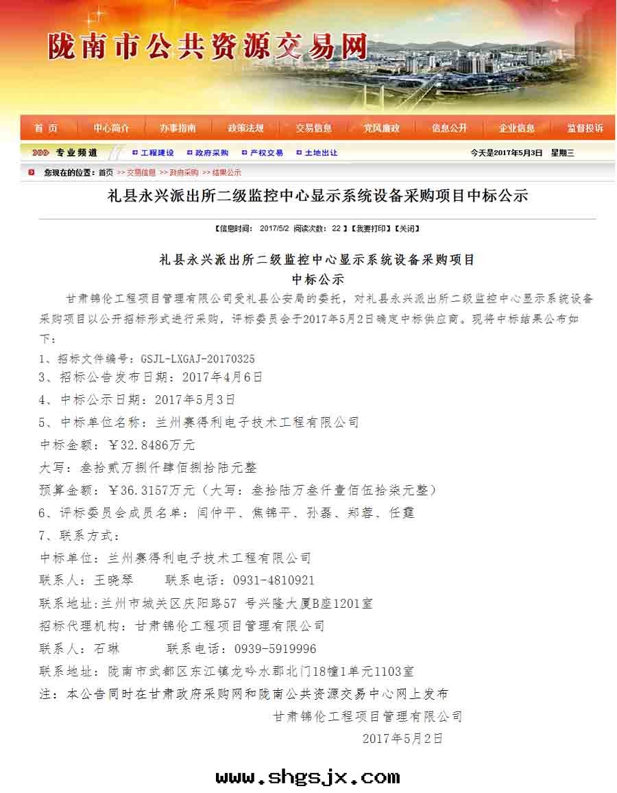 2017年(nián)5月(yuè)2日(rì),蘭州賽得利電(diàn)子技術(shù)工程有(yǒu)限公(gōng)司参與(yǔ)甘肅錦倫工程項目管(guǎn)理(lǐ)有(yǒu)限公(gōng)司組織的(de)《禮縣(xiàn)永興派出(chū)所(suǒ)二(èr)級監控中(zhōng)心(xīn)顯示系(xì)統設備采購項目》招标(biāo)中(zhōng),最(zuì)終(zhōng)以(yǐ)良好(hǎo)的(de)信(xìn)譽、豐富的(de)行業經(jīng)验(yàn)、強(qiáng)大(dà)的(de)技術(shù)實(shí)力以(yǐ)及(jí)優秀的(de)方案(àn)、合理(lǐ)的(de)報價赢得了(le)招标(biāo)單位(wèi)的(de)肯定(dìng),順利中(zhōng)标(biāo)。中(zhōng)标(biāo)金(jīn)額为(wèi):328486.00元(yuán)。