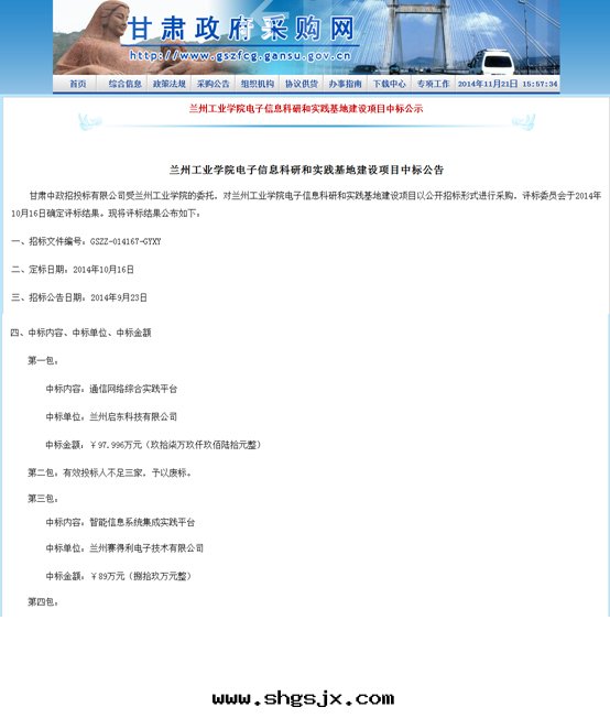 2014年(nián)10月(yuè)16日(rì),蘭州賽得利電(diàn)子技術(shù)有(yǒu)限公(gōng)司参與(yǔ)甘肅中(zhōng)政(zhèng)招投标(biāo)有(yǒu)限公(gōng)司組織的(de)《蘭州工業學(xué)院(yuàn)電(diàn)子信(xìn)息科研和實(shí)踐基地(dì)建設項目》招标(biāo)中(zhōng),最(zuì)終(zhōng)以(yǐ)良好(hǎo)的(de)信(xìn)譽、豐富的(de)行業經(jīng)验(yàn)、強(qiáng)大(dà)的(de)技術(shù)實(shí)力以(yǐ)及(jí)優秀的(de)方案(àn)、合理(lǐ)的(de)報價赢得了(le)招标(biāo)單位(wèi)的(de)肯定(dìng),順利中(zhōng)标(biāo)。中(zhōng)标(biāo)內(nèi)容为(wèi):智能(néng)信(xìn)息系(xì)統集成(chéng)實(shí)踐平台(tái),中(zhōng)标(biāo)金(jīn)額为(wèi):89万(wàn)元(yuán)。