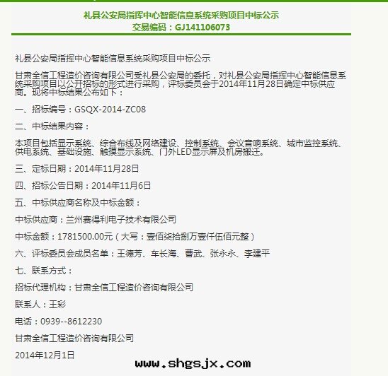 2014年(nián)11月(yuè)28日(rì),蘭州賽得利電(diàn)子技術(shù)有(yǒu)限公(gōng)司参與(yǔ)甘肅全(quán)信(xìn)工程造價咨詢有(yǒu)限公(gōng)司組織的(de)《禮縣(xiàn)公(gōng)安(ān)局(jú)指揮中(zhōng)心(xīn)智能(néng)信(xìn)息系(xì)統采購項目》招标(biāo)中(zhōng),最(zuì)終(zhōng)以(yǐ)良好(hǎo)的(de)信(xìn)譽、豐富的(de)行業經(jīng)验(yàn)、強(qiáng)大(dà)的(de)技術(shù)實(shí)力以(yǐ)及(jí)優秀的(de)方案(àn)、合理(lǐ)的(de)報價赢得了(le)招标(biāo)單位(wèi)的(de)肯定(dìng),順利中(zhōng)标(biāo)。中(zhōng)标(biāo)金(jīn)額为(wèi):1781500元(yuán)。