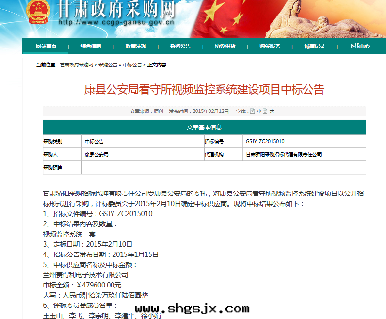 2015年(nián)2月(yuè)10日(rì),蘭州賽得利電(diàn)子技術(shù)有(yǒu)限公(gōng)司参與(yǔ)甘肅驕陽采購招标(biāo)代(dài)理(lǐ)有(yǒu)限責任公(gōng)司組織的(de)《康縣(xiàn)公(gōng)安(ān)局(jú)看(kàn)守所(suǒ)視頻監控系(xì)統建設項目》招标(biāo)中(zhōng),最(zuì)終(zhōng)以(yǐ)良好(hǎo)的(de)信(xìn)譽、豐富的(de)行業經(jīng)验(yàn)、強(qiáng)大(dà)的(de)技術(shù)實(shí)力以(yǐ)及(jí)優秀的(de)方案(àn)、合理(lǐ)的(de)報價赢得了(le)招标(biāo)單位(wèi)的(de)肯定(dìng),順利中(zhōng)标(biāo)。中(zhōng)标(biāo)金(jīn)額为(wèi):479600.00元(yuán),在(zài)2015年(nián)4月(yuè)15日(rì)全(quán)部(bù)验(yàn)收(shōu)通(tòng)过(guò),試運行10个(gè)月(yuè)、至(zhì)今零(líng)售后。